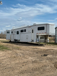 Horse area has a stud divider and removable rear tack. Quest Limited Car Hauler. Living quarters has propane heat microwave sink fridge stove and a separate washroom with a shower toilet and cupboard space.